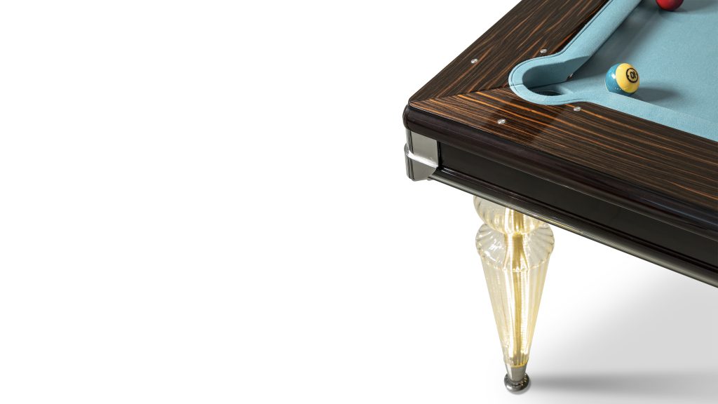 Tavolo da biliardo con piano rivestito in panno. Struttura in legno laccato lucido. Gambe in vetro di Murano trasparente o colorato.