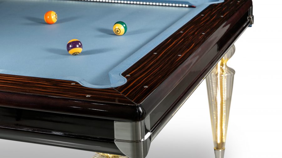 Optional: Illuminazione Led perimetrale per il piano e per le gambe e porta-stecche da Biliardo in vetro a specchio con supporti in vetro extrachiaro.
